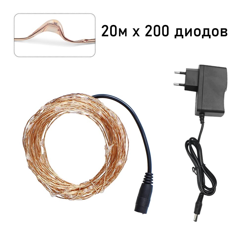 Нить "Роса" медь, 20 м х 200 диодов, от сети,холодный белый
