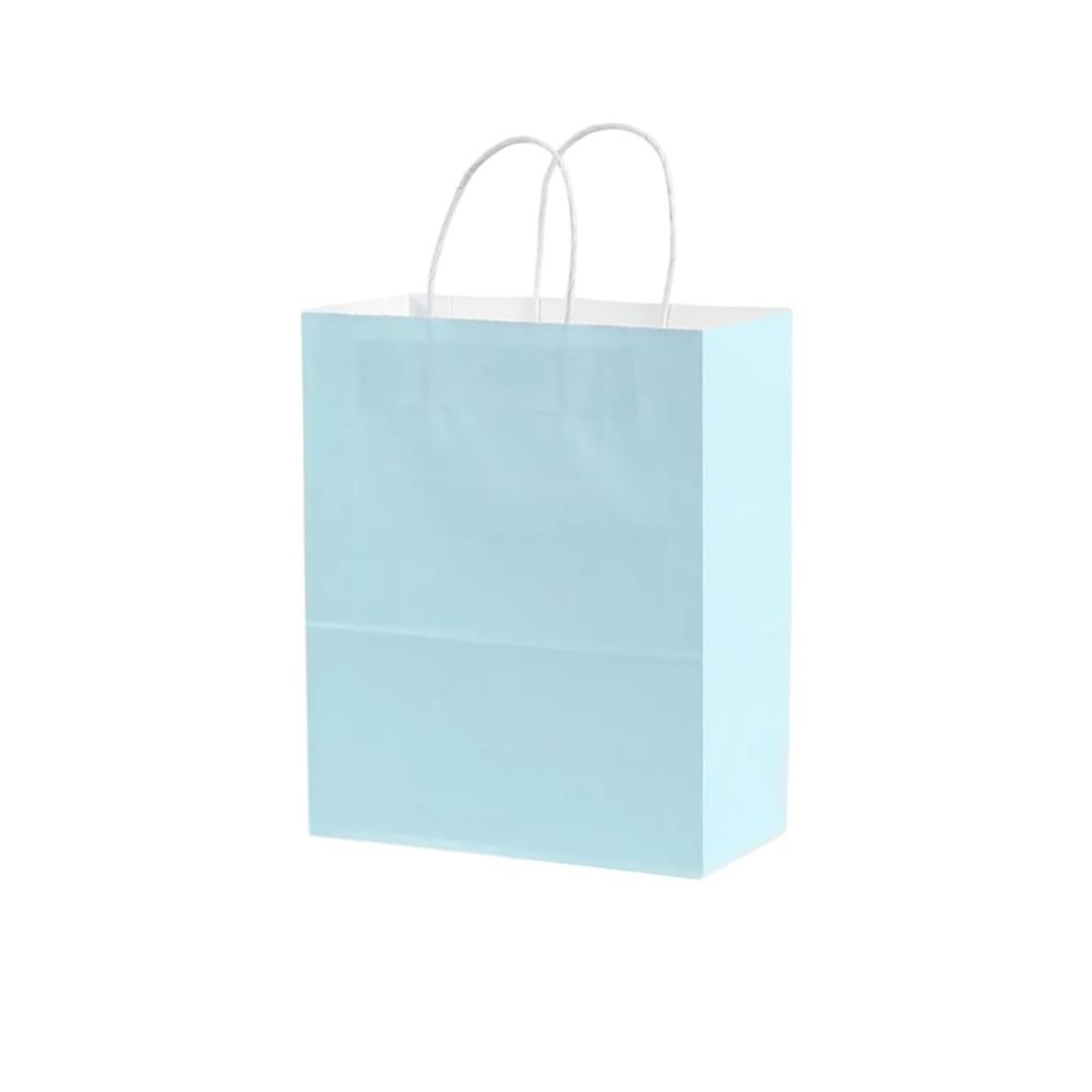 Подарочный пакет из крафтовой бумаги пастельного оттенка с белыми бумажными ручками и белой внутренней стороной.