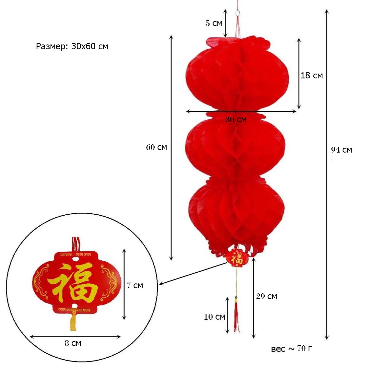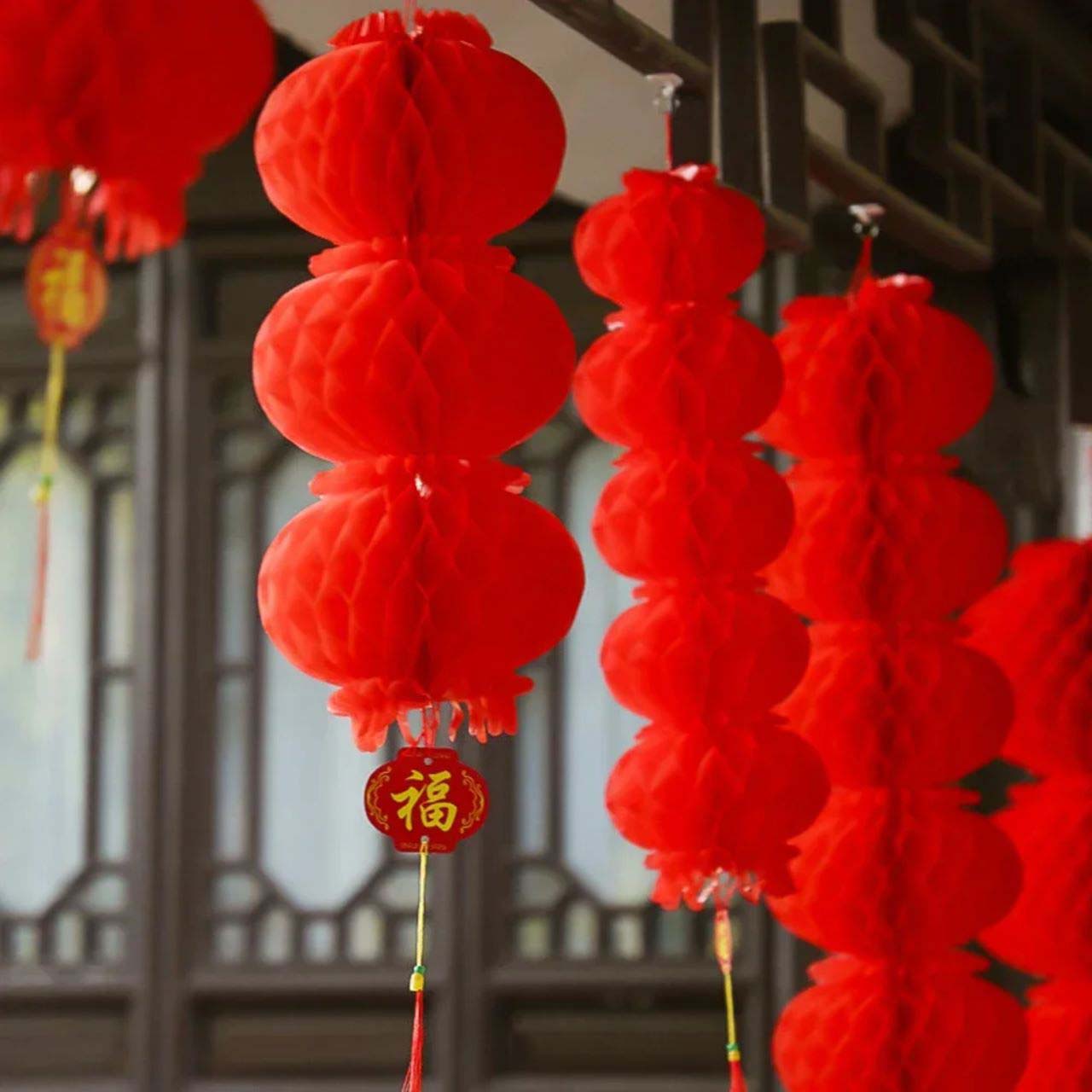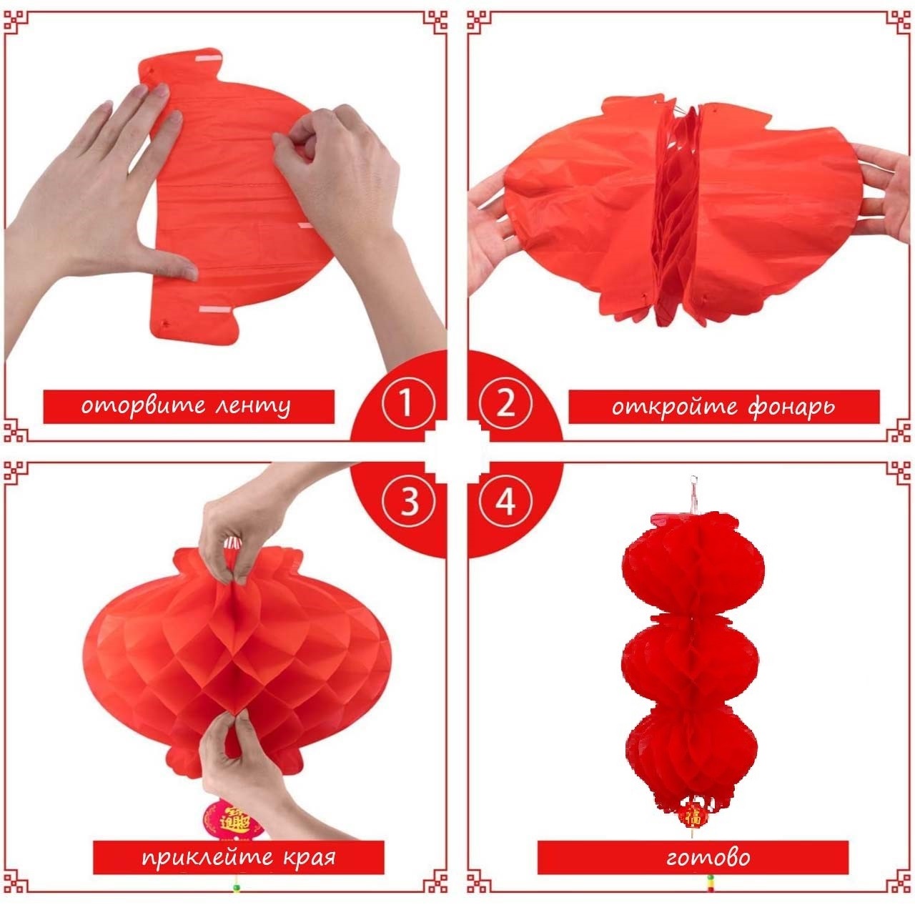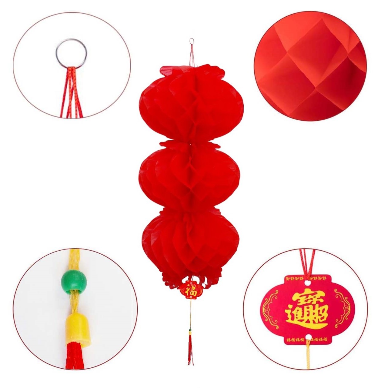 Простота в использовании: Бумажные фонарики имеют форму пчелиных сот с плотными отверстиями, их легко разворачивать и сворачивать. Раскройте концы и склейте их вместе (белая липкая двусторонняя лента на одном конце). Красный бумажный фонарь с кольцом и веревкой сверху легко подвешивается и снимается.