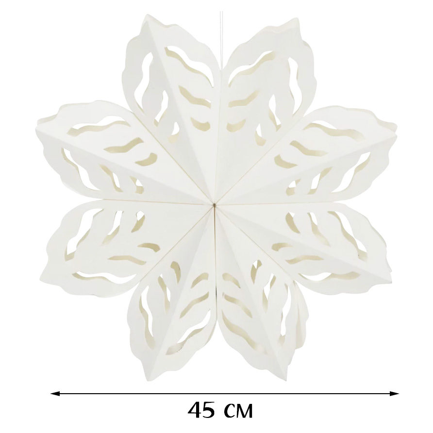 Элегантная объёмная снежинка из плотной бумаги белого цвета — изысканное украшение для зимнего интерьера, витрин, залов и новогодних фотозон. Ажурный рисунок придаёт ей лёгкость и воздушность, создавая ощущение снежной свежести и уюта.